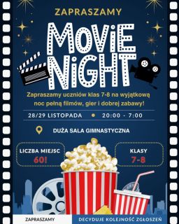 Zapraszamy uczniów klas 7-8 do wzięcia udziału w wyjątkowym wydarzeniu - "Nocy Filmowej" organizowanej na terenie naszej szkoły.