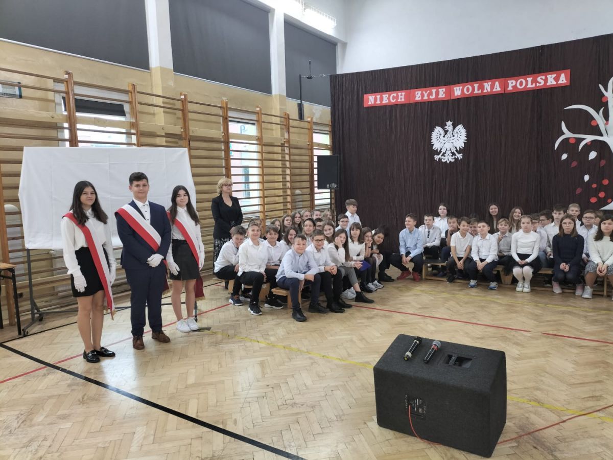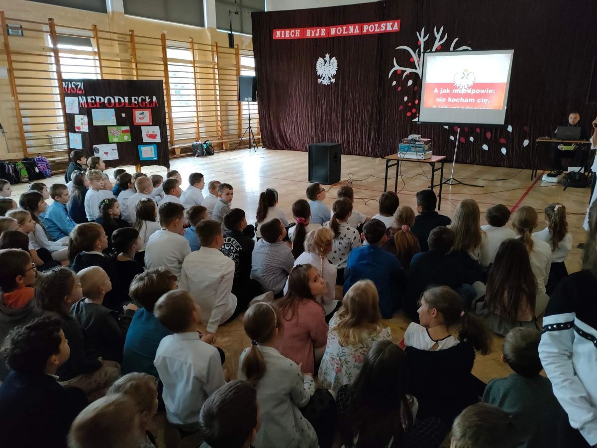 Z okazji upamiętnienia 104-tej rocznicy Odzyskania Niepodległości uczniowie klas 5a,5b,5c pod czujnym okiem pań Anny Gierczak-Macek, Małgorzaty Sadrak oraz Marzeny Sidło przygotowali uroczystą akademię.